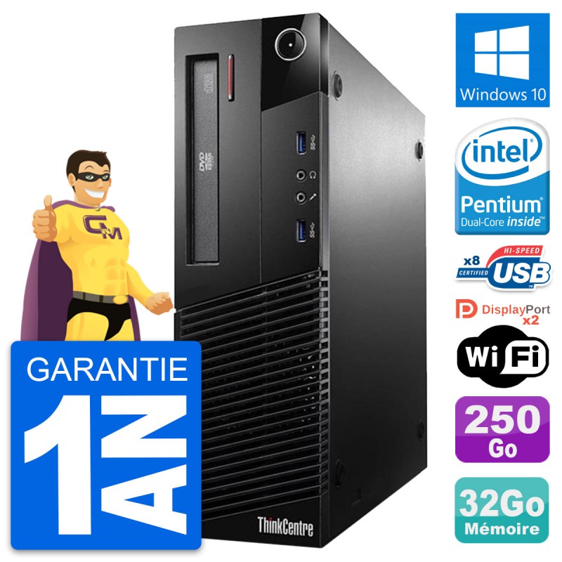 PC Lenovo ThinkCentre M93p SFF (Slim) - Intel Pentium G3220 3.0 Ghz (3 Mo) - 32 Go DDR3 - Disque Dur 3,5" 250 Go - Graveur DVD - Clef Wifi USB - Windows 10 - Garantie 1 an.