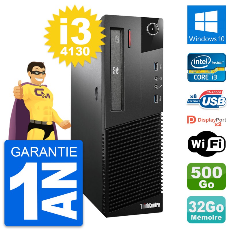 PC Lenovo ThinkCentre M93p SFF i3-4130 RAM 32Go Disque 500Go Windows 10 Wifi