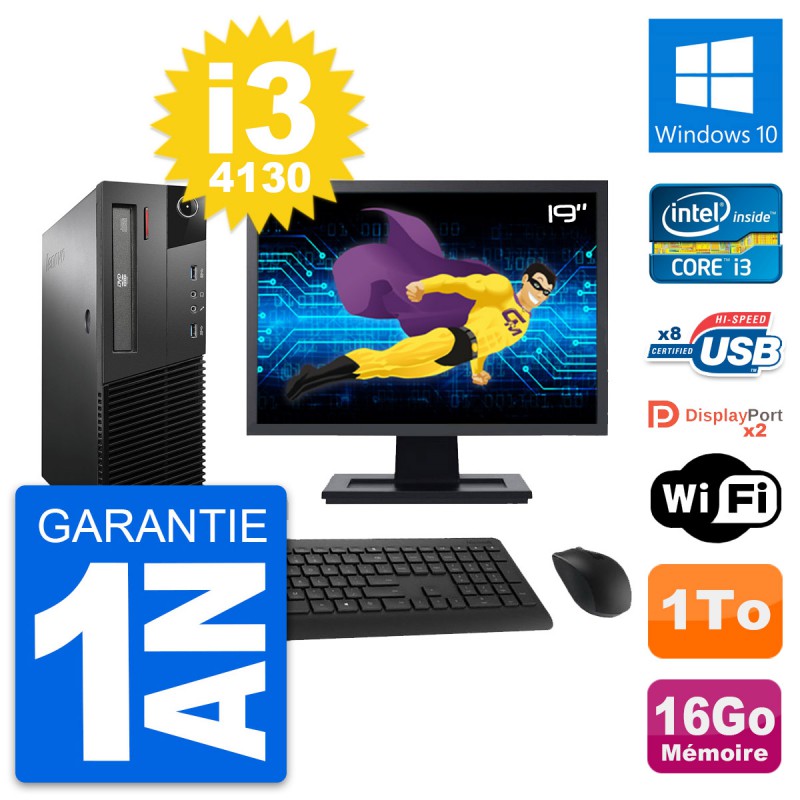 PC Lenovo ThinkCentre M93p SFF (Slim) - Intel Core i3-4130 3.4 Ghz (3 Mo) - 16 Go DDR3 - Disque Dur 3,5" 1 To - Graveur DVD - Clef Wifi USB - Windows 10 - Livré avec Ecran 19" + clavier + souris (Marques et modèles variables) - Garantie 1 an.