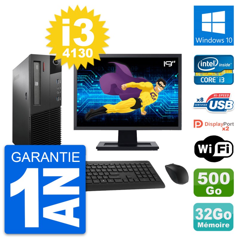 PC Lenovo ThinkCentre M93p SFF (Slim) - Intel Core i3-4130 3.4 Ghz (3 Mo) - 32 Go DDR3 - Disque Dur 3,5" 500 Go - Graveur DVD - Clef Wifi USB - Windows 10 - Livré avec Ecran 19" + clavier + souris (Marques et modèles variables) - Garantie 1 an.