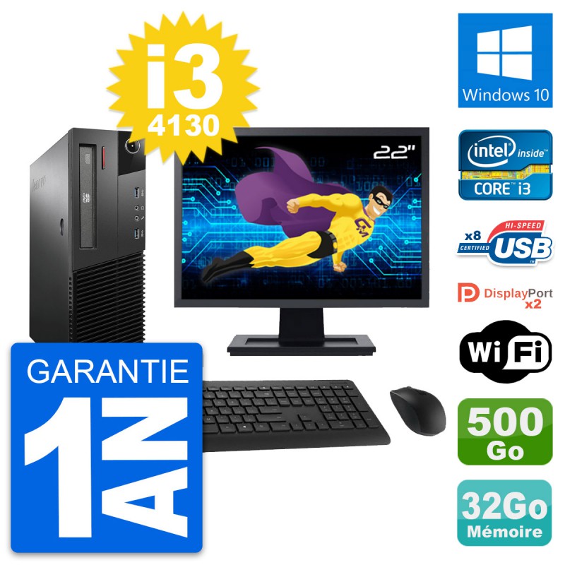 PC Lenovo ThinkCentre M93p SFF (Slim) - Intel Core i3-4130 3.4 Ghz (3 Mo) - 32 Go DDR3 - Disque Dur 3,5" 500 Go - Graveur DVD - Clef Wifi USB - Windows 10 - Livré avec Ecran 22" + clavier + souris (Marques et modèles variables) - Garantie 1 an.