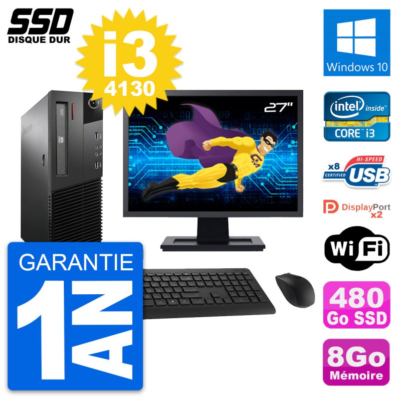 PC Lenovo ThinkCentre M93p SFF (Slim) - Intel Core i3-4130 3.4 Ghz (3 Mo) - 8 Go DDR3 - Disque Dur SSD 480 Go - Graveur DVD - Clef Wifi USB - Windows 10 - Livré avec Ecran 27" + clavier + souris (Marques et modèles variables) - Garantie 1 an.