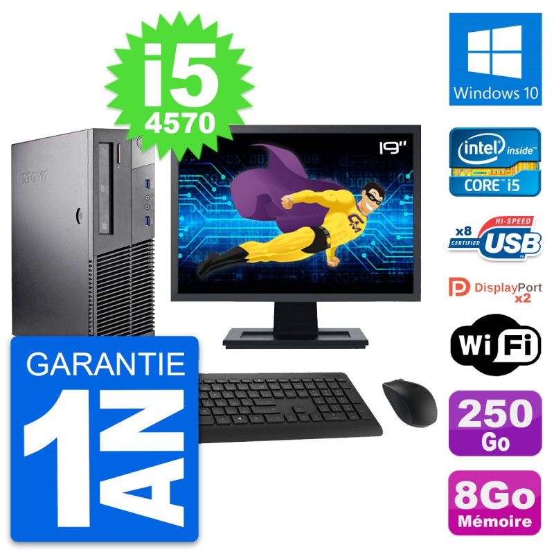 PC Lenovo ThinkCentre M93p SFF (Slim) - Intel Core i5-4570 3.2 Ghz (6 Mo) - 8 Go DDR3 - Disque Dur 3,5" 250 Go - Graveur DVD - Clef Wifi USB - Windows 10 - Livré avec Ecran 19" + clavier + souris (Marques et modèles variables) - Garantie 1 an.