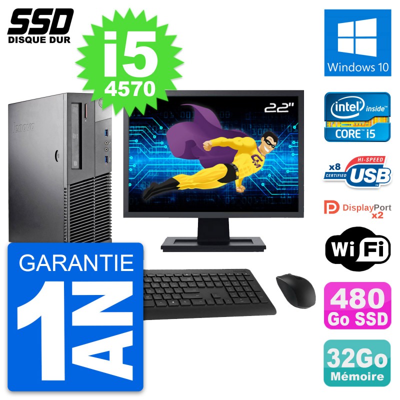 PC Lenovo ThinkCentre M93p SFF (Slim) - Intel Core i5-4570 3.2 Ghz (6 Mo) - 32 Go DDR3 - Disque Dur SSD 480 Go - Graveur DVD - Clef Wifi USB - Windows 10 - Livré avec Ecran 22" + clavier + souris (Marques et modèles variables) - Garantie 1 an.
