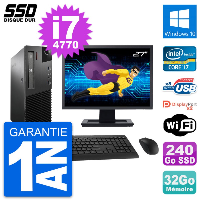 PC Lenovo ThinkCentre M93p SFF (Slim) - Intel Core i7-4770 3.4 Ghz (8 Mo) - 32 Go DDR3 - Disque Dur SSD 240 Go - Graveur DVD - Clef Wifi USB - Windows 10 - Livré avec Ecran 27" + clavier + souris (Marques et modèles variables) - Garantie 1 an.