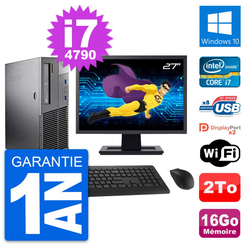 PC Lenovo ThinkCentre M93p SFF (Slim) - Intel Core i7-4790 3.6 Ghz (8 Mo) - 16 Go DDR3 - Disque Dur 3,5" 2 To - Graveur DVD - Clef Wifi USB - Windows 10 - Livré avec Ecran 27" + clavier + souris (Marques et modèles variables) - Garantie 1 an.