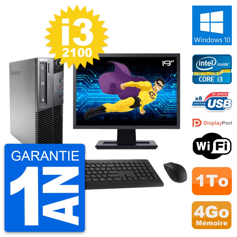 PC Lenovo M81 SFF Ecran 19" Intel i3-2100 RAM 4Go Disque Dur 1To Windows 10 Wifi
