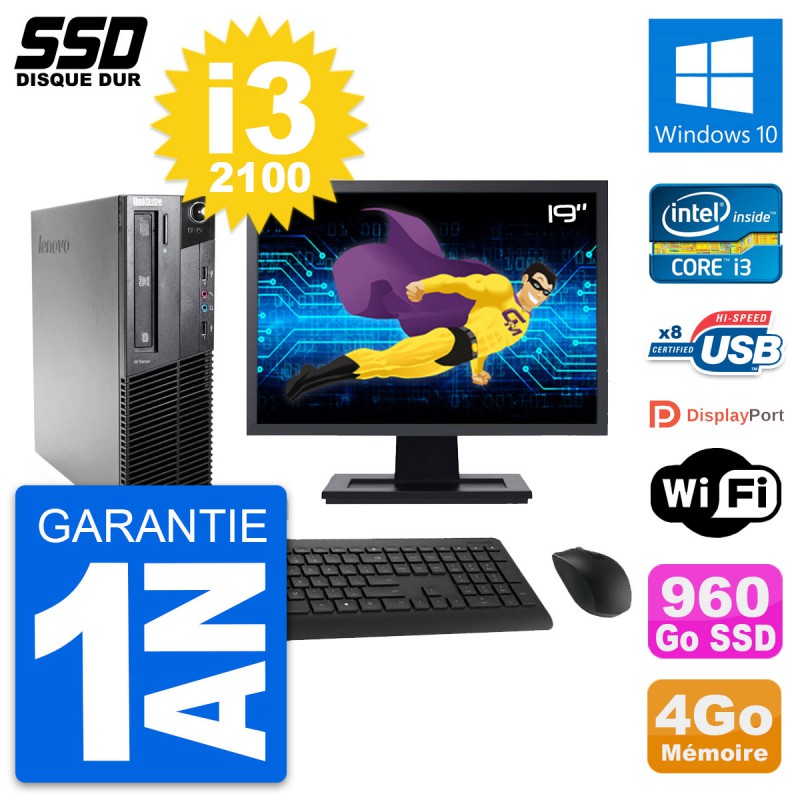 PC Lenovo M81 SFF - Intel Core i3-2100 3.1 Ghz (3 Mo) - 4 Go DDR3 - Disque Dur SSD 960 Go - Graveur DVD - Clef Wifi USB - Windows 10 - Livré avec Ecran 19" + clavier + souris (Marques et modèles variables) - Garantie 1 an.
