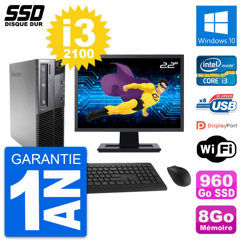 PC Lenovo M81 SFF - Intel Core i3-2100 3.1 Ghz (3 Mo) - 8 Go DDR3 - Disque Dur SSD 960 Go - Graveur DVD - Clef Wifi USB - Windows 10 - Livré avec Ecran 22" + clavier + souris (Marques et modèles variables) - Garantie 1 an.
