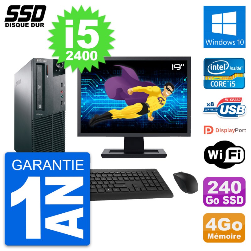 PC Lenovo M81 SFF - Intel Core i5-2400 3.1 Ghz (6 Mo) - 4 Go DDR3 - Disque Dur SSD 240 Go - Graveur DVD - Clef Wifi USB - Windows 10 - Livré avec Ecran 19" + clavier + souris (Marques et modèles variables) - Garantie 1 an.