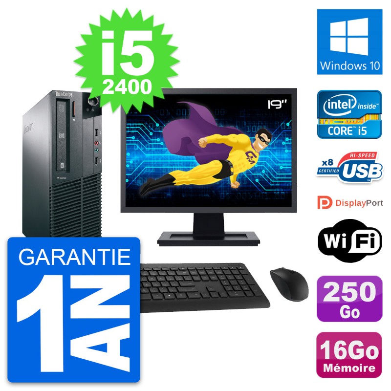 PC Lenovo M81 SFF - Intel Core i5-2400 3.1 Ghz (6 Mo) - 16 Go DDR3 - Disque Dur 3,5" 250 Go - Graveur DVD - Clef Wifi USB - Windows 10 - Livré avec Ecran 19" + clavier + souris (Marques et modèles variables) - Garantie 1 an.