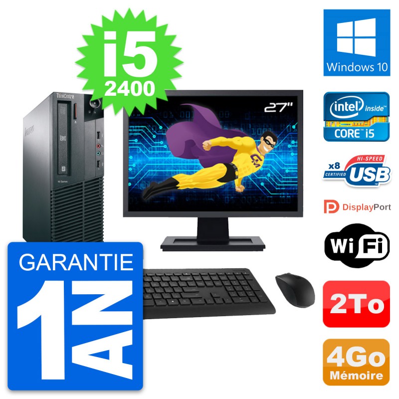 PC Lenovo M81 SFF - Intel Core i5-2400 3.1 Ghz (6 Mo) - 4 Go DDR3 - Disque Dur 3,5" 2 To - Graveur DVD - Clef Wifi USB - Windows 10 - Livré avec Ecran 27" + clavier + souris (Marques et modèles variables) - Garantie 1 an.