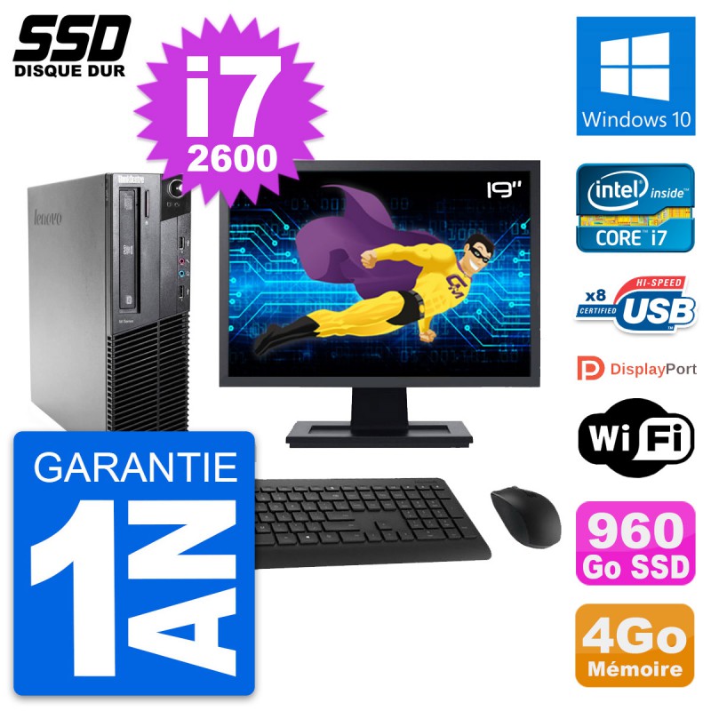 PC Lenovo M81 SFF - Intel Core i7-2600 3.4 Ghz (8 Mo) - 4 Go DDR3 - Disque Dur SSD 960 Go - Graveur DVD - Clef Wifi USB - Windows 10 - Livré avec Ecran 19" + clavier + souris (Marques et modèles variables) - Garantie 1 an.