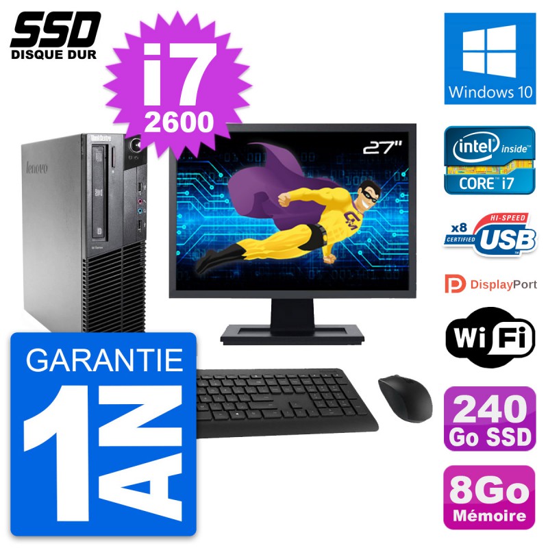 PC Lenovo M81 SFF - Intel Core i7-2600 3.4 Ghz (8 Mo) - 8 Go DDR3 - Disque Dur SSD 240 Go - Graveur DVD - Clef Wifi USB - Windows 10 - Livré avec Ecran 27" + clavier + souris (Marques et modèles variables) - Garantie 1 an.