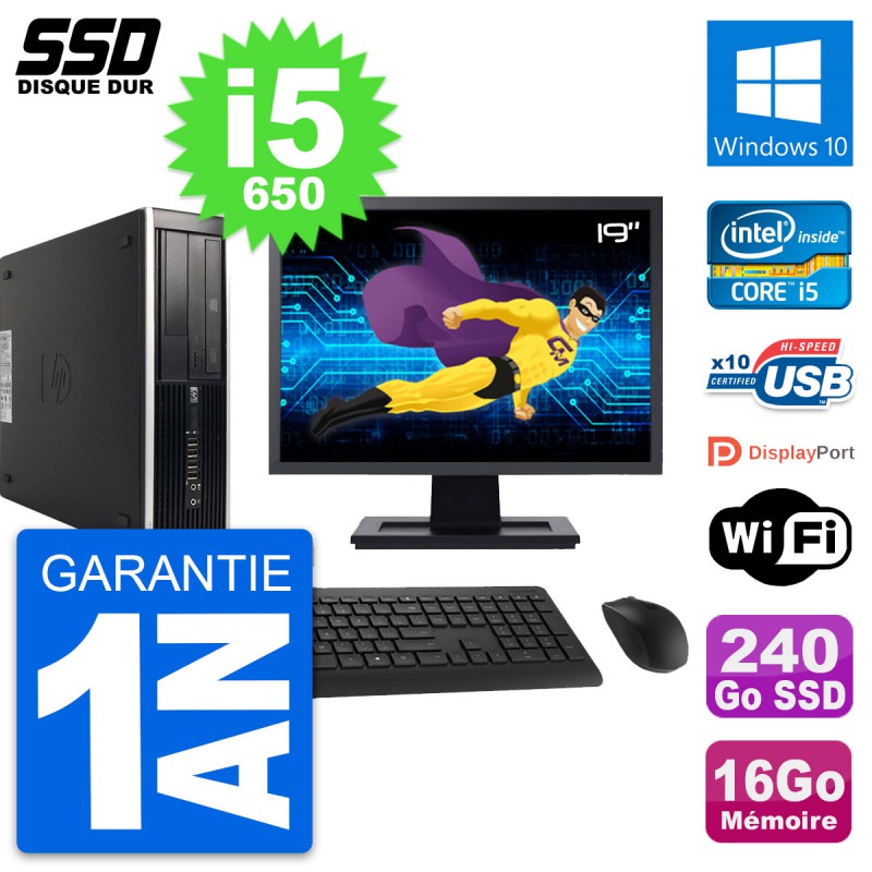 PC HP 8100 Elite SFF - Intel Core i5-650 3.2 Ghz (4 Mo) - 16 Go DDR3 - Disque Dur SSD 240 Go - Graveur DVD - Clef Wifi USB - Windows 10 - Livré avec Ecran 19" + clavier + souris (Marques et modèles variables) - Garantie 1 an.