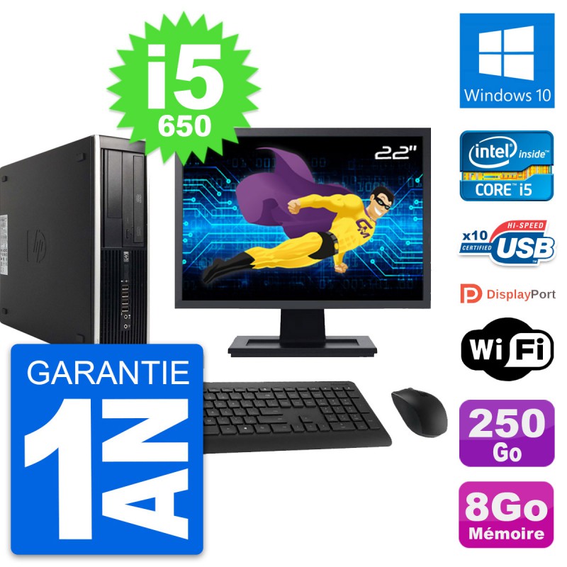 PC HP 8100 Elite SFF Ecran 22" Core i5-650 RAM 8Go Disque 250Go Windows 10 Wifi