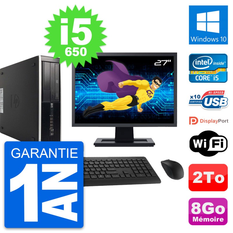 PC HP 8100 Elite SFF - Intel Core i5-650 3.2 Ghz (4 Mo) - 8 Go DDR3 - Disque Dur 3,5" 2 To - Graveur DVD - Clef Wifi USB - Windows 10 - Livré avec Ecran 27" + clavier + souris (Marques et modèles variables) - Garantie 1 an.