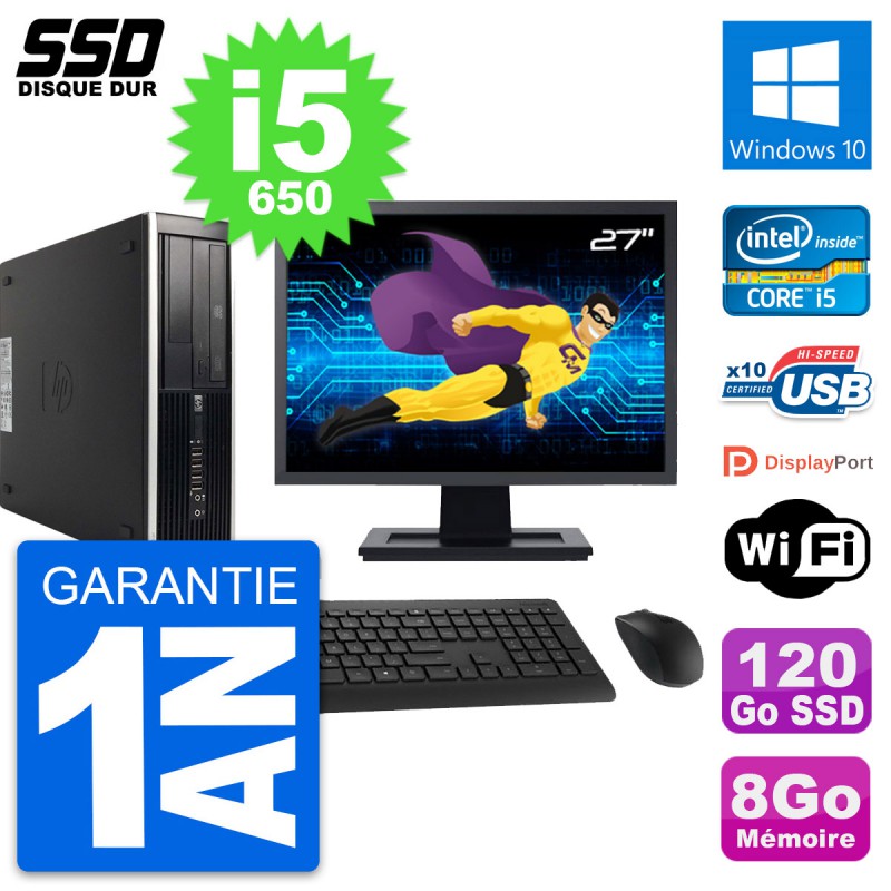 PC HP 8100 Elite SFF - Intel Core i5-650 3.2 Ghz (4 Mo) - 8 Go DDR3 - Disque Dur SSD 120 Go - Graveur DVD - Clef Wifi USB - Windows 10 - Livré avec Ecran 27" + clavier + souris (Marques et modèles variables) - Garantie 1 an.