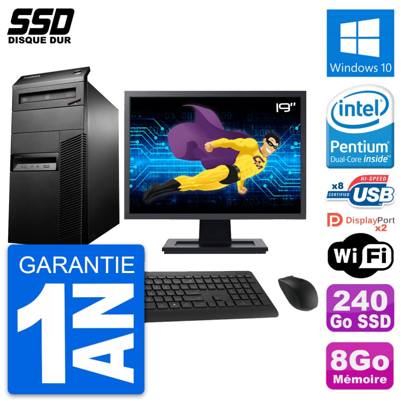 PC Tour Lenovo ThinkCentre M93p MT - Intel Pentium G3220 3.0 Ghz (3 Mo) - 8 Go DDR3 - Disque Dur SSD 240 Go - Graveur DVD - Clef Wifi USB - Windows 10 - Livré avec Ecran 19" + clavier + souris (Marques et modèles variables) - Garantie 1 an.