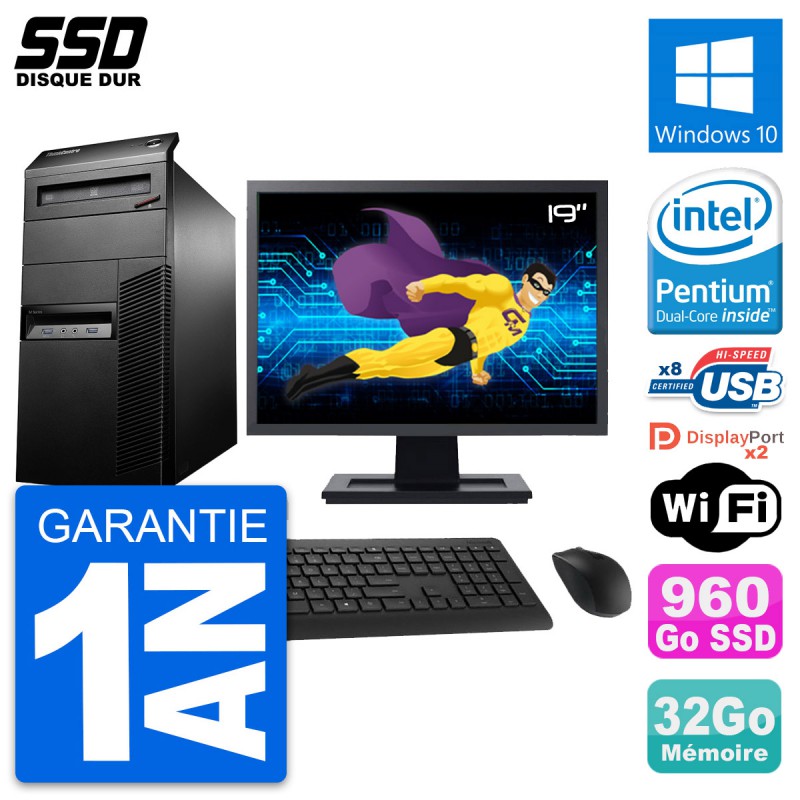 PC Tour Lenovo ThinkCentre M93p MT - Intel Pentium G3220 3.0 Ghz (3 Mo) - 32 Go DDR3 - Disque Dur SSD 960 Go - Graveur DVD - Clef Wifi USB - Windows 10 - Livré avec Ecran 19" + clavier + souris (Marques et modèles variables) - Garantie 1 an.