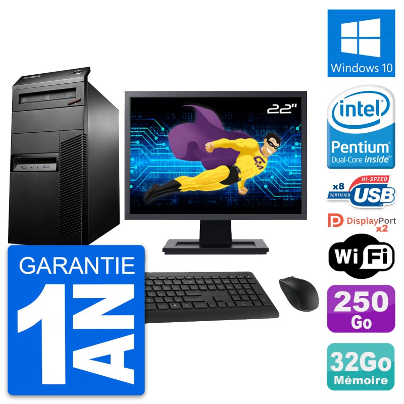 PC Tour Lenovo ThinkCentre M93p MT - Intel Pentium G3220 3.0 Ghz (3 Mo) - 32 Go DDR3 - Disque Dur 3,5" 250 Go - Graveur DVD - Clef Wifi USB - Windows 10 - Livré avec Ecran 22" + clavier + souris (Marques et modèles variables) - Garantie 1 an.