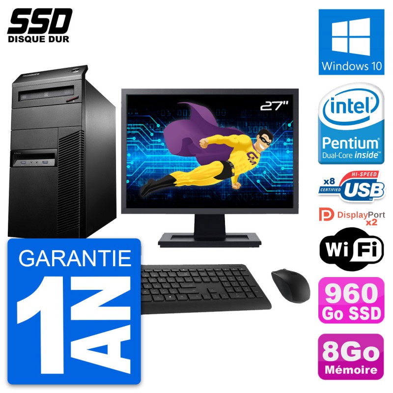 PC Tour Lenovo ThinkCentre M93p MT - Intel Pentium G3220 3.0 Ghz (3 Mo) - 8 Go DDR3 - Disque Dur SSD 960 Go - Graveur DVD - Clef Wifi USB - Windows 10 - Livré avec Ecran 27" + clavier + souris (Marques et modèles variables) - Garantie 1 an.