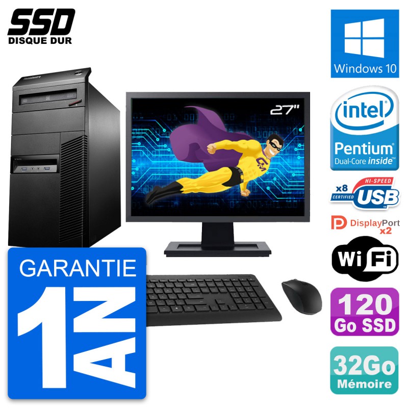PC Tour Lenovo ThinkCentre M93p MT - Intel Pentium G3220 3.0 Ghz (3 Mo) - 32 Go DDR3 - Disque Dur SSD 120 Go - Graveur DVD - Clef Wifi USB - Windows 10 - Livré avec Ecran 27" + clavier + souris (Marques et modèles variables) - Garantie 1 an.