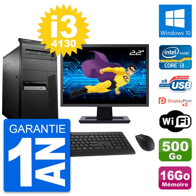 PC Tour Lenovo ThinkCentre M93p MT - Intel Core i3-4130 3.4 Ghz (3 Mo) - 16 Go DDR3 - Disque Dur 3,5" 500 Go - Graveur DVD - Clef Wifi USB - Windows 10 - Livré avec Ecran 22" + clavier + souris (Marques et modèles variables) - Garantie 1 an.