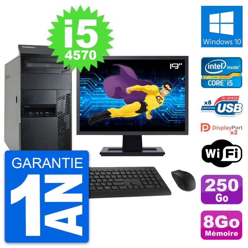 PC Tour Lenovo ThinkCentre M93p MT - Intel Core i5-4570 3.2 Ghz (6 Mo) - 8 Go DDR3 - Disque Dur 3,5" 250 Go - Graveur DVD - Clef Wifi USB - Windows 10 - Livré avec Ecran 19" + clavier + souris (Marques et modèles variables) - Garantie 1 an.