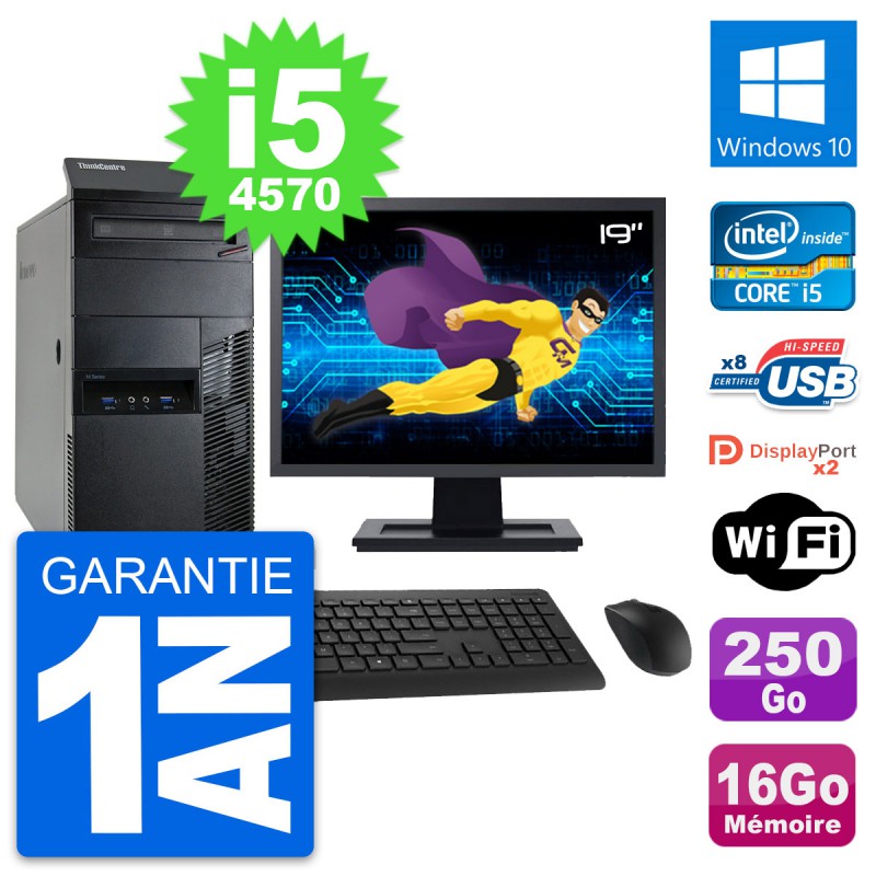 PC Tour Lenovo ThinkCentre M93p MT - Intel Core i5-4570 3.2 Ghz (6 Mo) - 16 Go DDR3 - Disque Dur 3,5" 250 Go - Graveur DVD - Clef Wifi USB - Windows 10 - Livré avec Ecran 19" + clavier + souris (Marques et modèles variables) - Garantie 1 an.