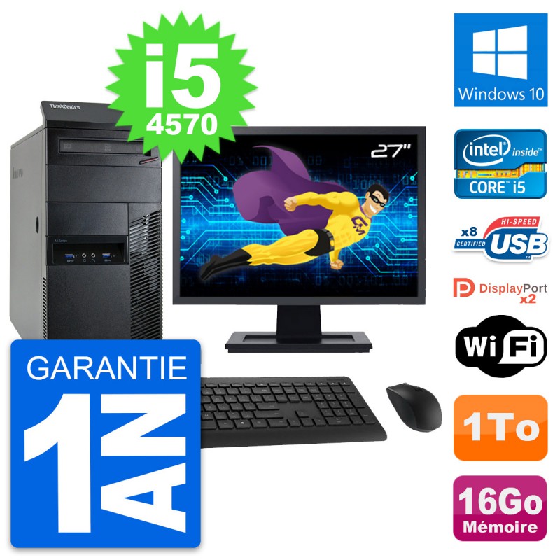 PC Tour Lenovo ThinkCentre M93p MT - Intel Core i5-4570 3.2 Ghz (6 Mo) - 16 Go DDR3 - Disque Dur 3,5" 1 To - Graveur DVD - Clef Wifi USB - Windows 10 - Livré avec Ecran 27" + clavier + souris (Marques et modèles variables) - Garantie 1 an.