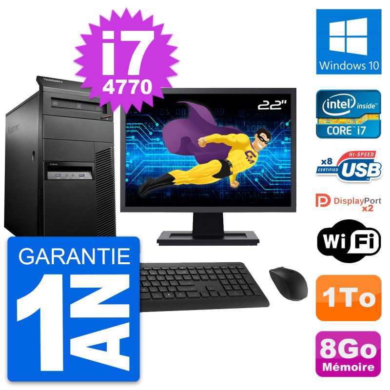 PC Tour Lenovo M93p Ecran 22" Intel i7-4770 RAM 8Go Disque 1To Windows 10 Wifi