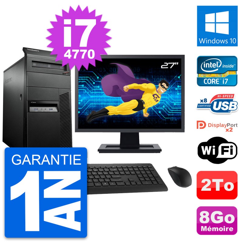 PC Tour Lenovo ThinkCentre M93p MT - Intel Core i7-4770 3.4 Ghz (8 Mo) - 8 Go DDR3 - Disque Dur 3,5" 2 To - Graveur DVD - Clef Wifi USB - Windows 10 - Livré avec Ecran 27" + clavier + souris (Marques et modèles variables) - Garantie 1 an.