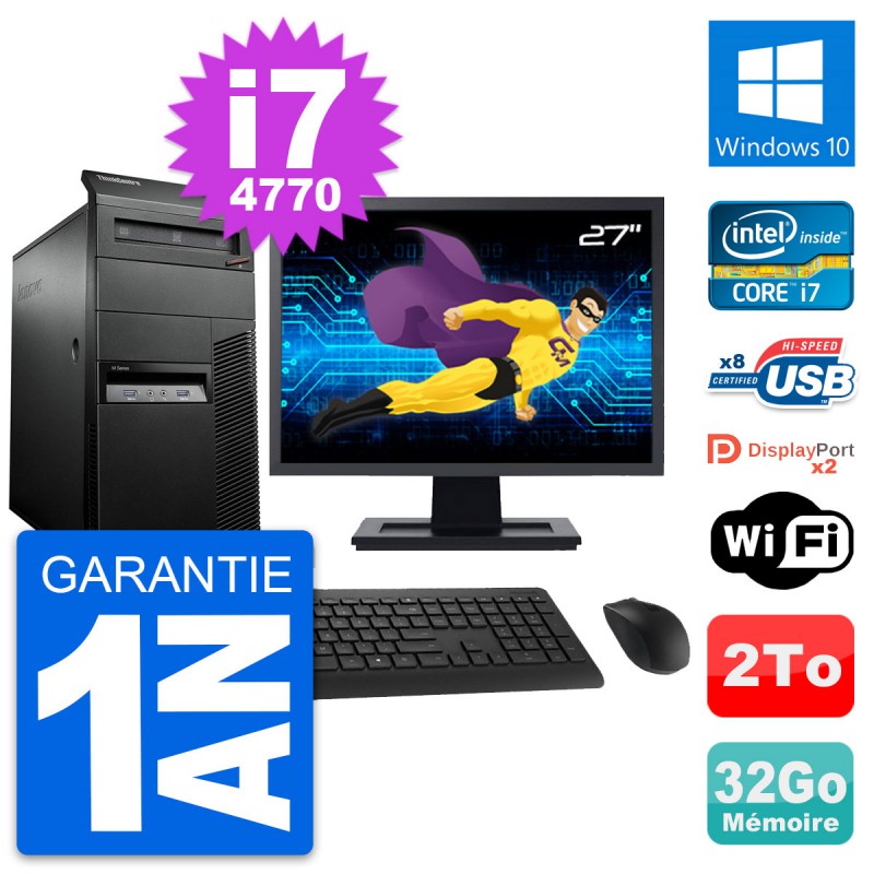 PC Tour Lenovo ThinkCentre M93p MT - Intel Core i7-4770 3.4 Ghz (8 Mo) - 32 Go DDR3 - Disque Dur 3,5" 2 To - Graveur DVD - Clef Wifi USB - Windows 10 - Livré avec Ecran 27" + clavier + souris (Marques et modèles variables) - Garantie 1 an.
