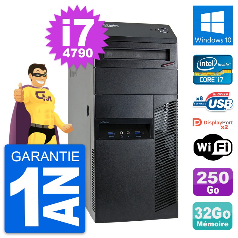 PC Tour Lenovo ThinkCentre M93p MT - Intel Core i7-4790 3.6 Ghz (8 Mo) - 32 Go DDR3 - Disque Dur 3,5" 250 Go - Graveur DVD - Clef Wifi USB - Windows 10 - Garantie 1 an.