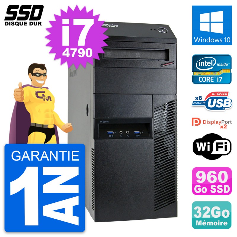 PC Tour Lenovo ThinkCentre M93p MT - Intel Core i7-4790 3.6 Ghz (8 Mo) - 32 Go DDR3 - Disque Dur SSD 960 Go - Graveur DVD - Clef Wifi USB - Windows 10 - Garantie 1 an.
