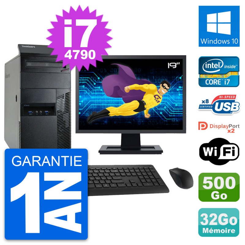 PC Tour Lenovo ThinkCentre M93p MT - Intel Core i7-4790 3.6 Ghz (8 Mo) - 32 Go DDR3 - Disque Dur 3,5" 500 Go - Graveur DVD - Clef Wifi USB - Windows 10 - Livré avec Ecran 19" + clavier + souris (Marques et modèles variables) - Garantie 1 an.
