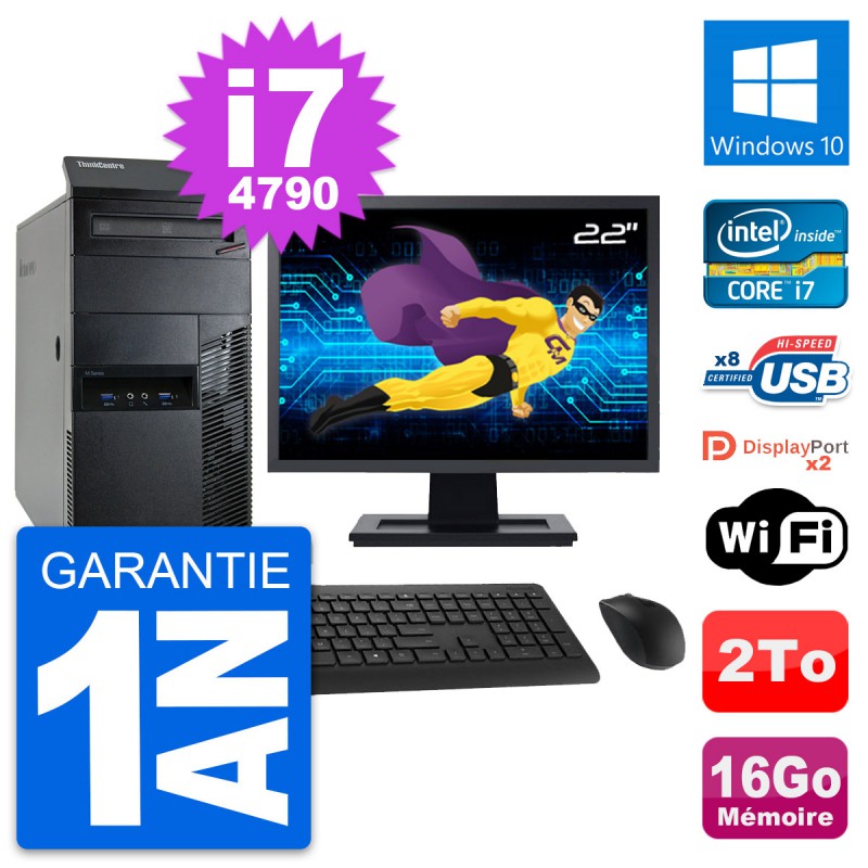 PC Tour Lenovo ThinkCentre M93p MT - Intel Core i7-4790 3.6 Ghz (8 Mo) - 16 Go DDR3 - Disque Dur 3,5" 2 To - Graveur DVD - Clef Wifi USB - Windows 10 - Livré avec Ecran 22" + clavier + souris (Marques et modèles variables) - Garantie 1 an.