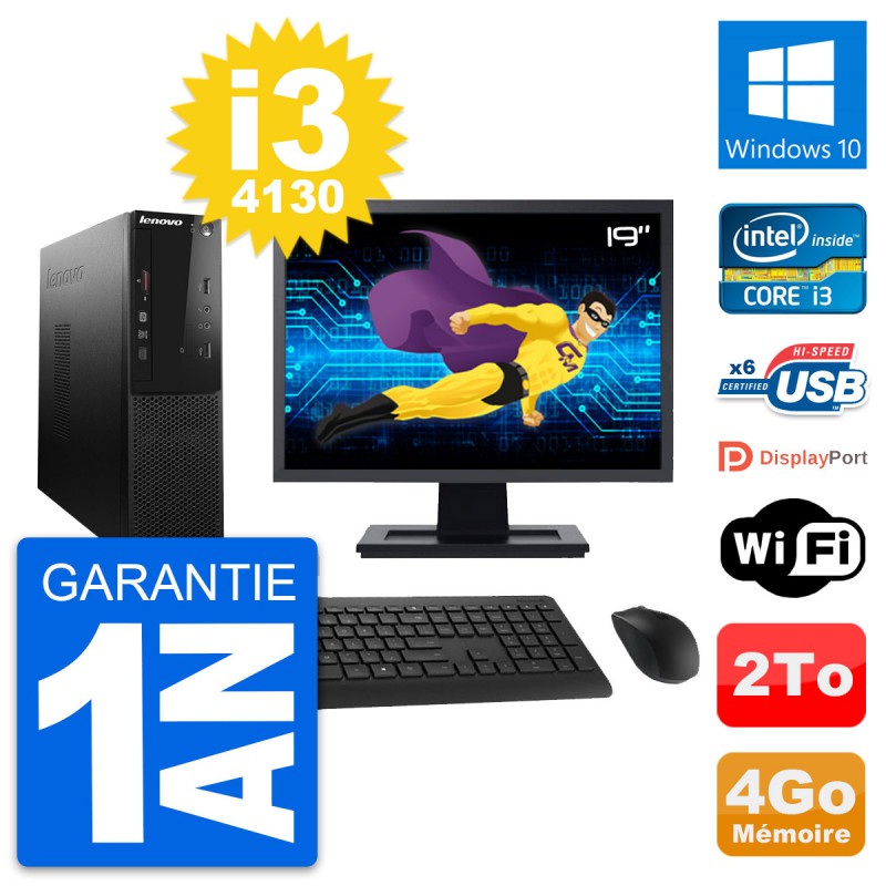 PC Lenovo S500 SFF - Intel Core i3-4130 3.4 Ghz (3 Mo) - 4 Go DDR3 - Disque Dur 3,5" 2 To - Graveur DVD - Clef Wifi USB - Windows 10 - Livré avec Ecran 19" + clavier + souris (Marques et modèles variables) - Garantie 1 an.