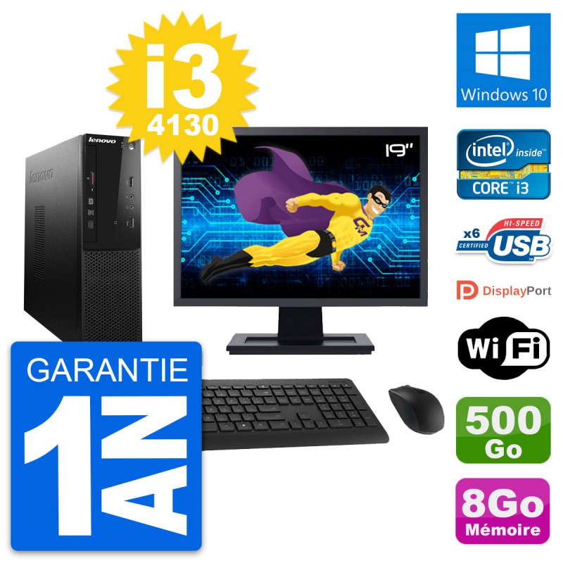 PC Lenovo S500 SFF - Intel Core i3-4130 3.4 Ghz (3 Mo) - 8 Go DDR3 - Disque Dur 3,5" 500 Go - Graveur DVD - Clef Wifi USB - Windows 10 - Livré avec Ecran 19" + clavier + souris (Marques et modèles variables) - Garantie 1 an.