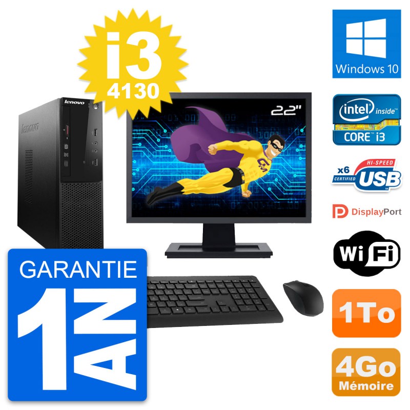 PC Lenovo S500 SFF - Intel Core i3-4130 3.4 Ghz (3 Mo) - 4 Go DDR3 - Disque Dur 3,5" 1 To - Graveur DVD - Clef Wifi USB - Windows 10 - Livré avec Ecran 22" + clavier + souris (Marques et modèles variables) - Garantie 1 an.