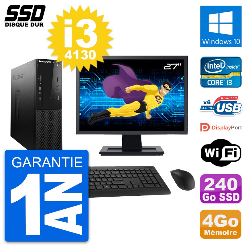 PC Lenovo S500 SFF - Intel Core i3-4130 3.4 Ghz (3 Mo) - 4 Go DDR3 - Disque Dur SSD 240 Go - Graveur DVD - Clef Wifi USB - Windows 10 - Livré avec Ecran 27" + clavier + souris (Marques et modèles variables) - Garantie 1 an.
