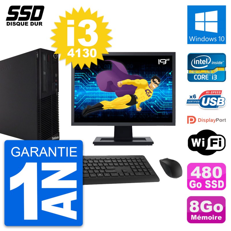 PC Lenovo M73 SFF Ecran 19" Intel i3-4130 RAM 8Go SSD 480Go Windows 10 Wifi