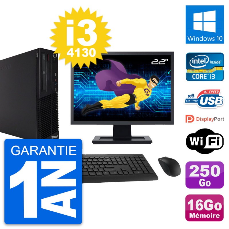 PC Lenovo M73 SFF Ecran 22" Intel i3-4130 RAM 16Go Disque 250Go Windows 10 Wifi