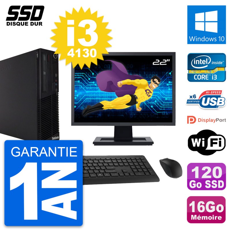 PC Lenovo M73 SFF Ecran 22" Intel i3-4130 RAM 16Go SSD 120Go Windows 10 Wifi