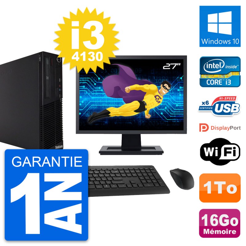 PC Lenovo M73 SFF Ecran 27" Intel i3-4130 RAM 16Go Disque 1To Windows 10 Wifi
