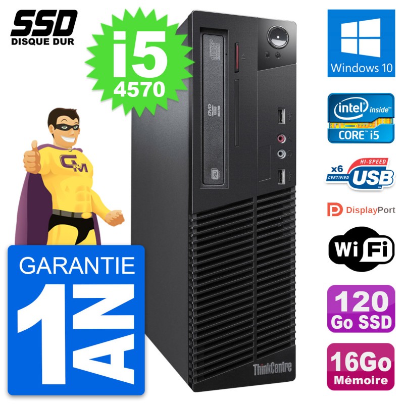 PC Lenovo ThinkCentre M73 SFF (Slim) - Intel Core i5-4570 3.2 Ghz (6 Mo) - 16 Go DDR3 - Disque Dur SSD 120 Go - Graveur DVD - Clef Wifi USB - Windows 10 - Garantie 1 an.