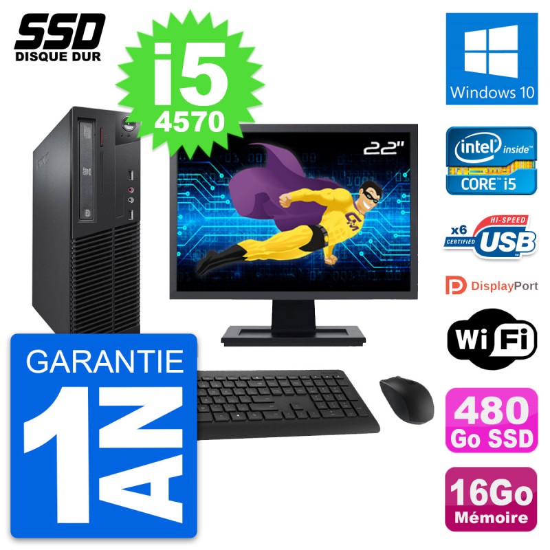 PC Lenovo M73 SFF Ecran 22" Intel i5-4570 RAM 16Go SSD 480Go Windows 10 Wifi