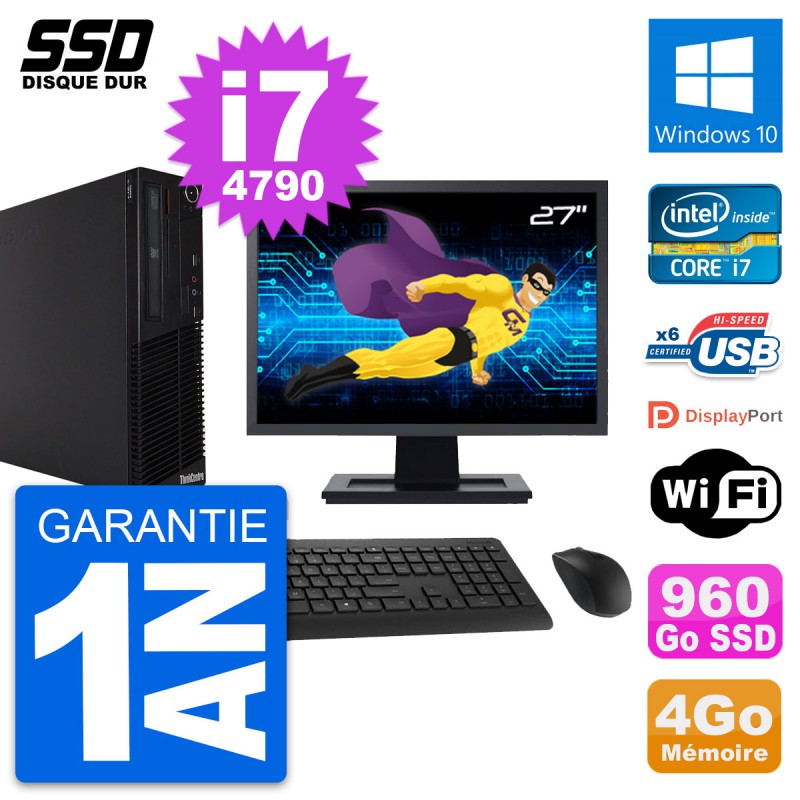 PC Lenovo M73 SFF Ecran 27" Intel i7-4790 RAM 4Go SSD 960Go Windows 10 Wifi