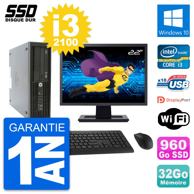 PC HP Z210 SFF Ecran 22" Intel Core i3-2100 RAM 32Go SSD 960Go Windows 10 Wifi